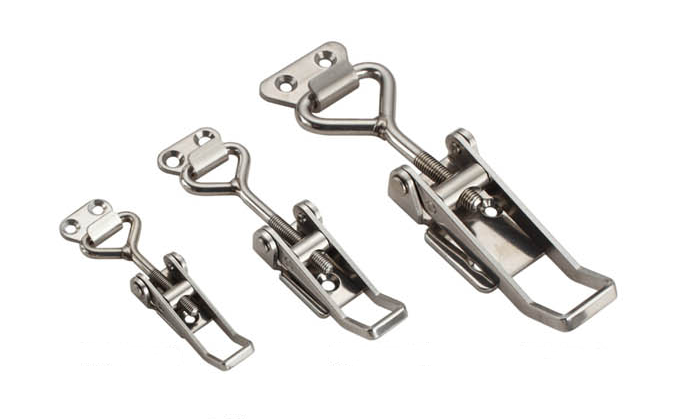 可调迫紧搭扣 螺纹调节搭扣 带挂锁搭扣 可调节扣件 不锈钢搭扣 产品特点:1.可安装于侧门和平门 2.不锈钢和铁两种材质可选 3.带螺纹调节扣,迫紧强度可调节 产品材质:不锈钢(SUS304)、铁(SPCC) 表面处理:振动研磨、镀镍